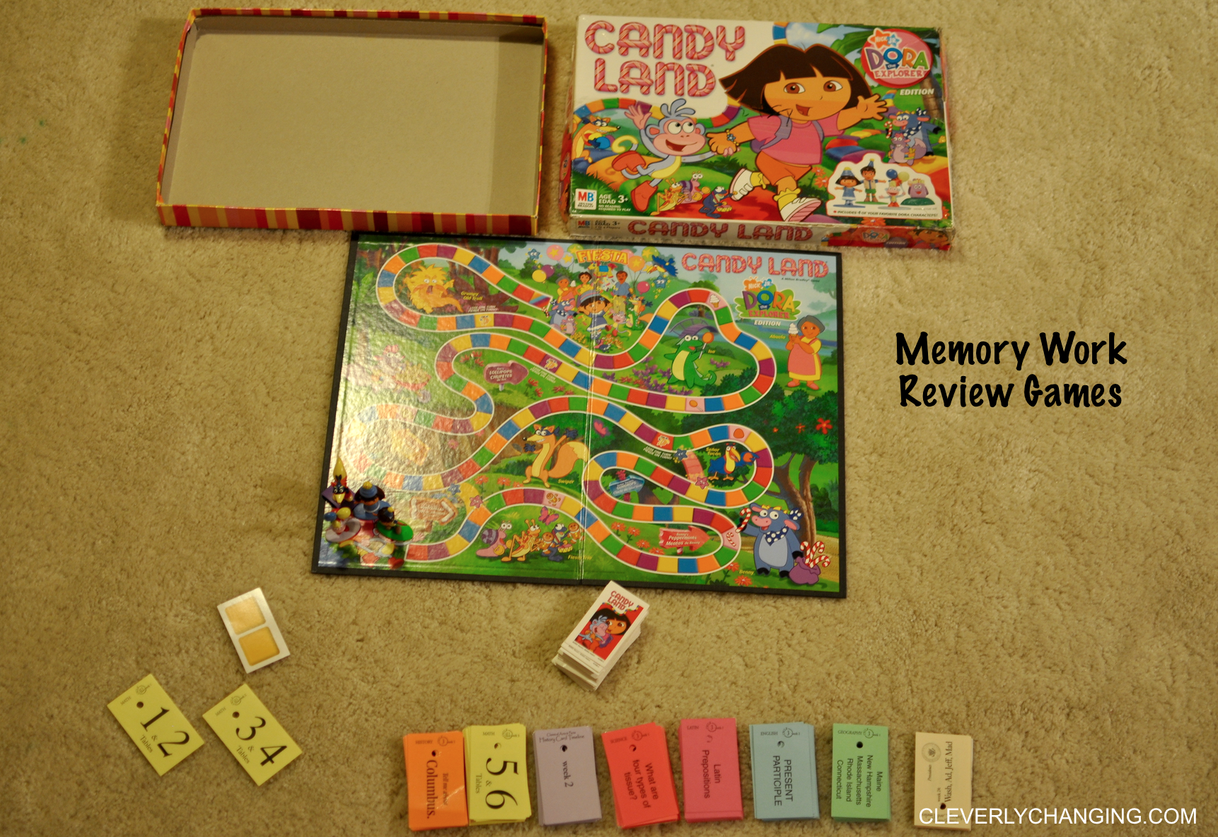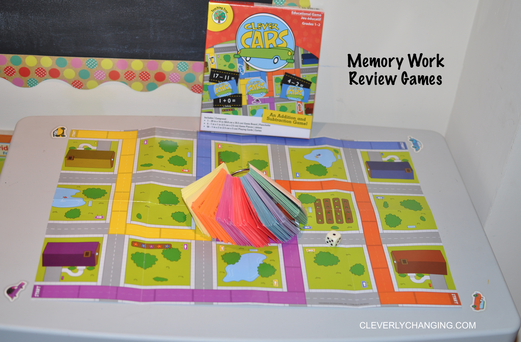 - Clever Cars (Dollar Store math Game) – This is a game we repurposed. Instead of using the math cards that came with the game we use replace them with cards from our weekly memory work. For each correct answer, the player gets to move one space.