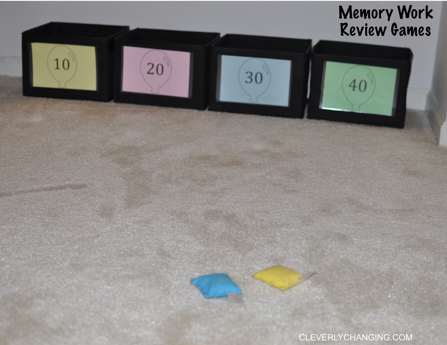 - Bag Toss – The square boxes with a subject and the amount of points the player will receive. Once your student tosses their bean bag they then can pick up a question from the box.