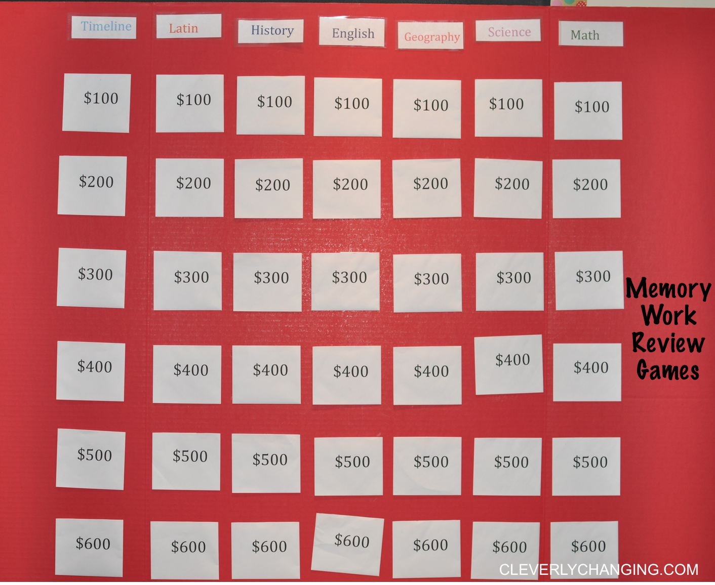 - Jeopardy – This game is the one I like the most because it’s constructive, inexpensive, easy to make, and allows kids to cover all of their memory work. I made out Jeopardy board last year and it still looks like new even after we moved. I only had to pay for the poster board because everything else we owned. Last year, I used the color coded memory cards made by Classical Conversation (CC), but this year each week I write the information on index cards (mainly because it helps me learn information and index cards are larger so they are easier to pull out of the pockets.)