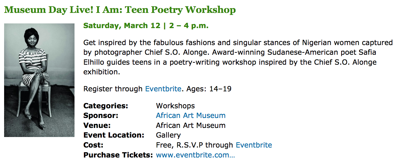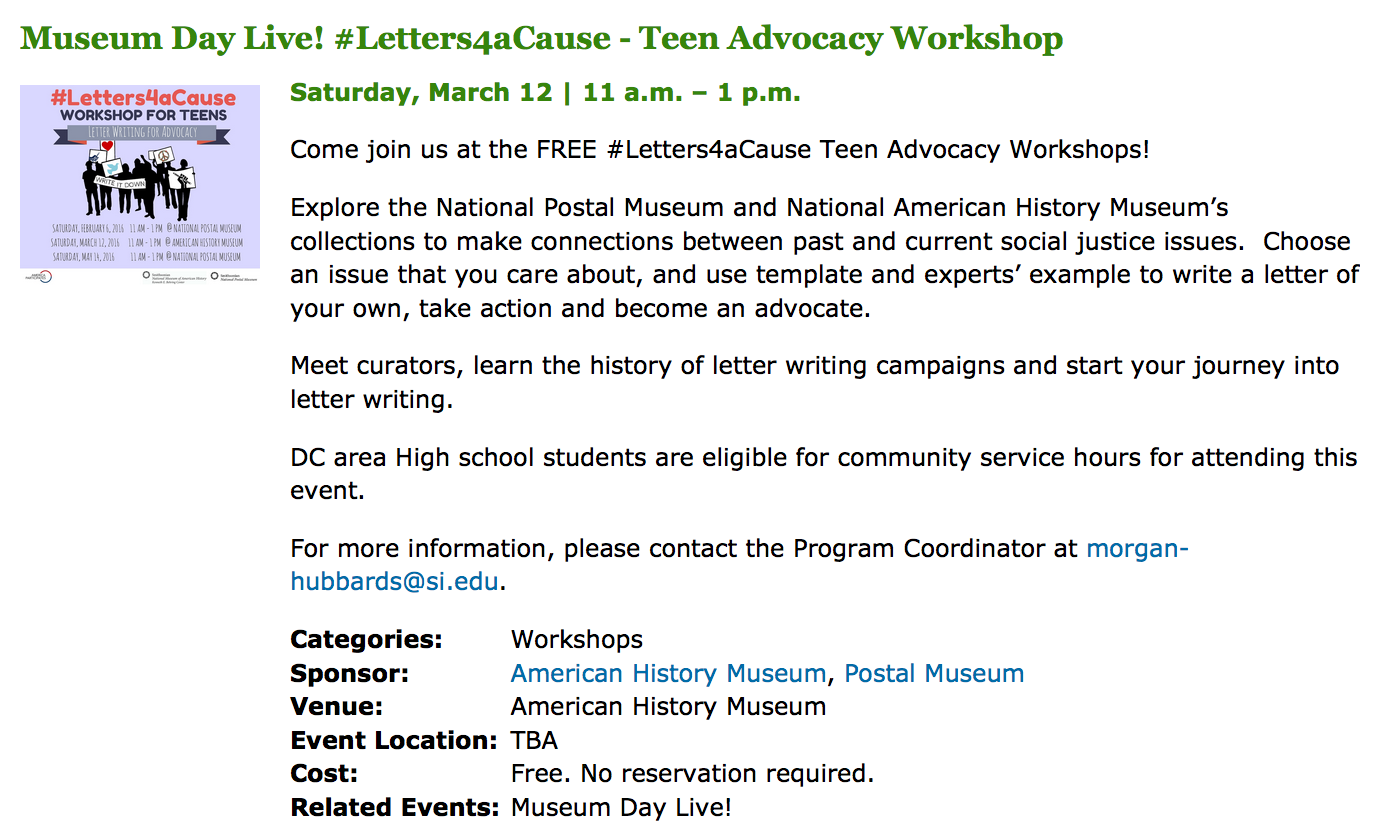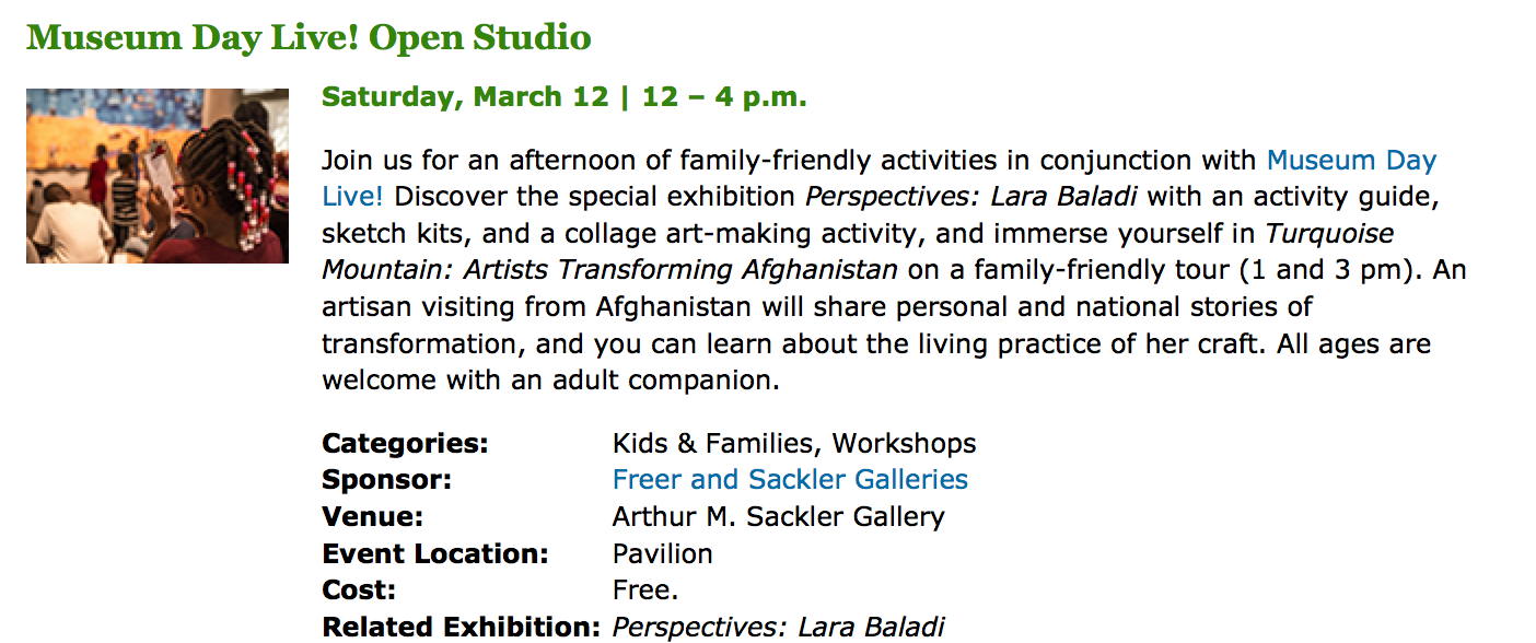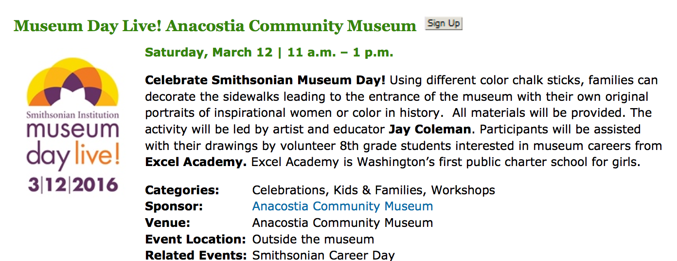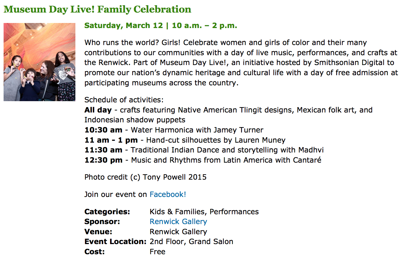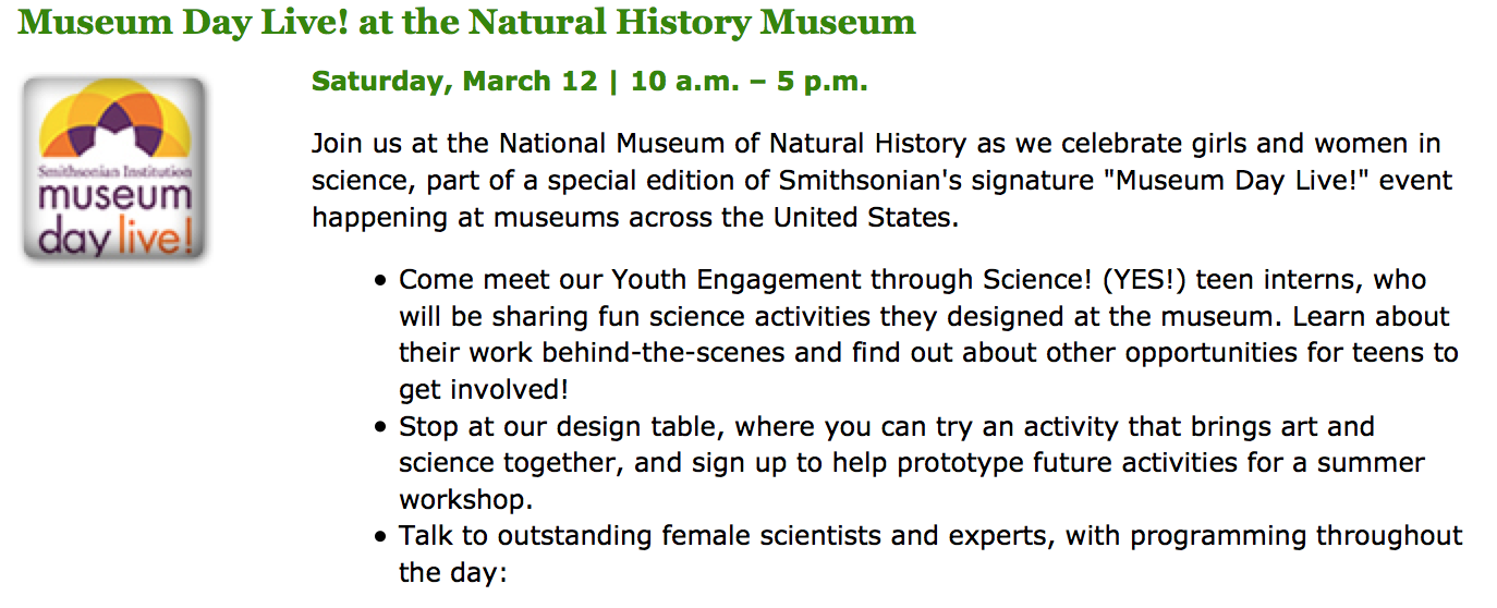 Museum Day Live will offer free admission to some museums; however, many special events will require a ticket. (*Also please note in the DC metro area, even though admission is often free, parking usually isn’t). To learn more about participating venues and the events pictured below visit: the official Museum Day Live website. This year the programs are amazing! In fact, there will be special programs and events at the museum specially geared toward young women from undeserved communities.