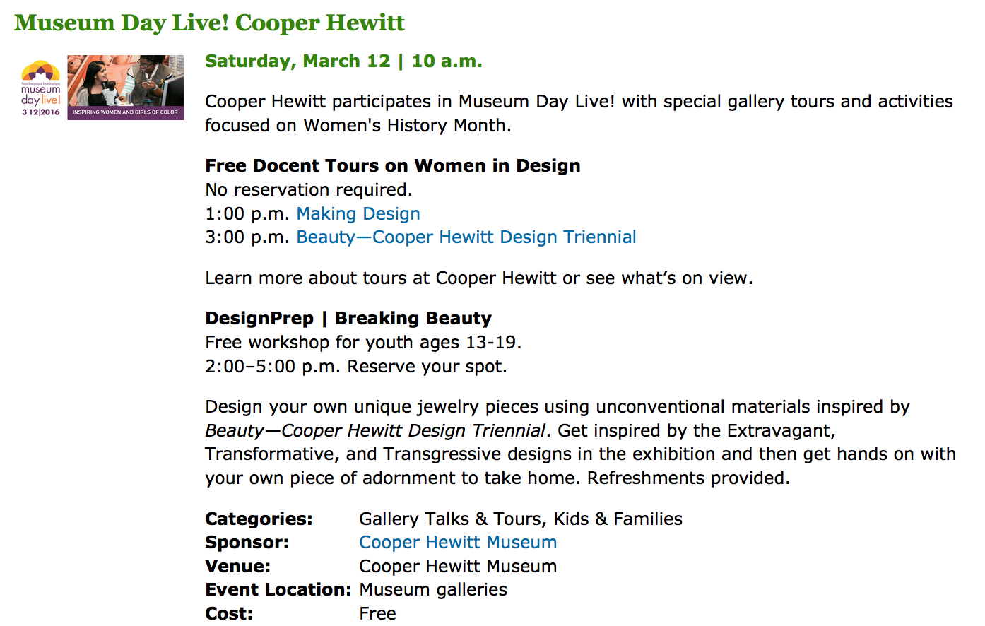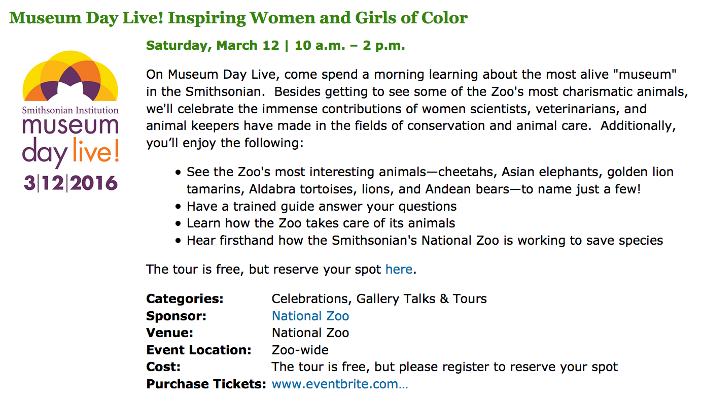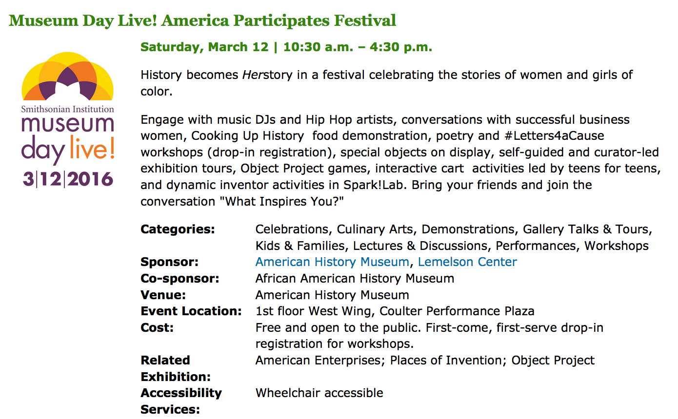 On Saturday, March 12, 2016, the White House and the Smithsonian Institution, together with hundreds of cultural institutions across the country, will celebrate a nationwide campaign to reach women and girls in under-served communities entitled Museum Day Live! Held during Women’s History Month, this event will encourage all people, and particularly women and girls of color, their peers and their families, to explore their nation’s museums, cultural institutions, zoos, aquariums, parks and libraries which will offer free admission for the day.