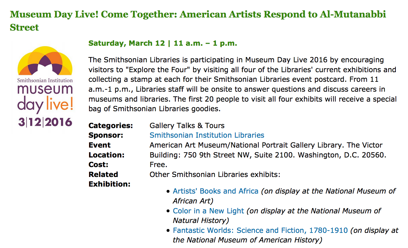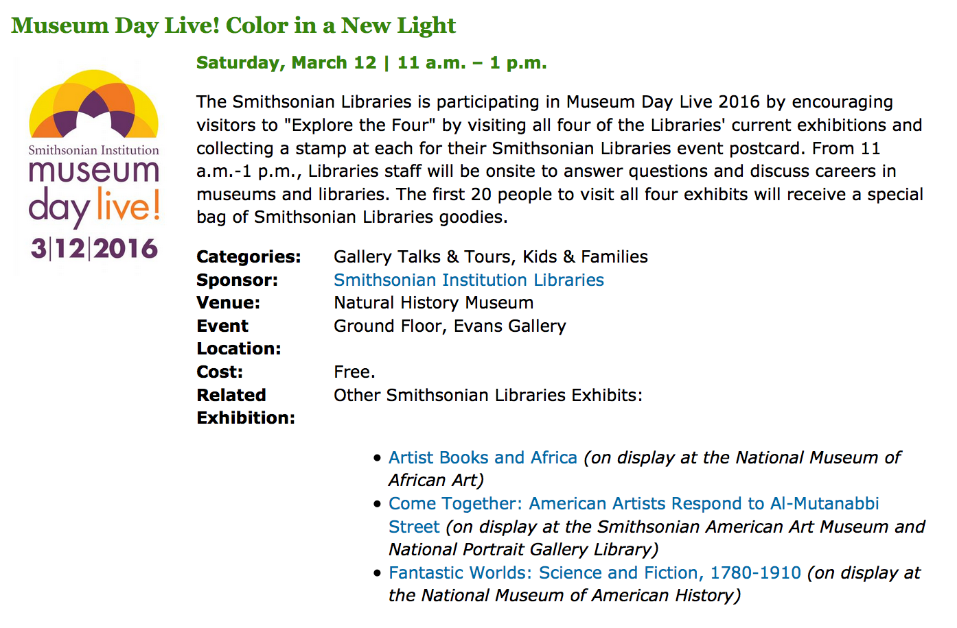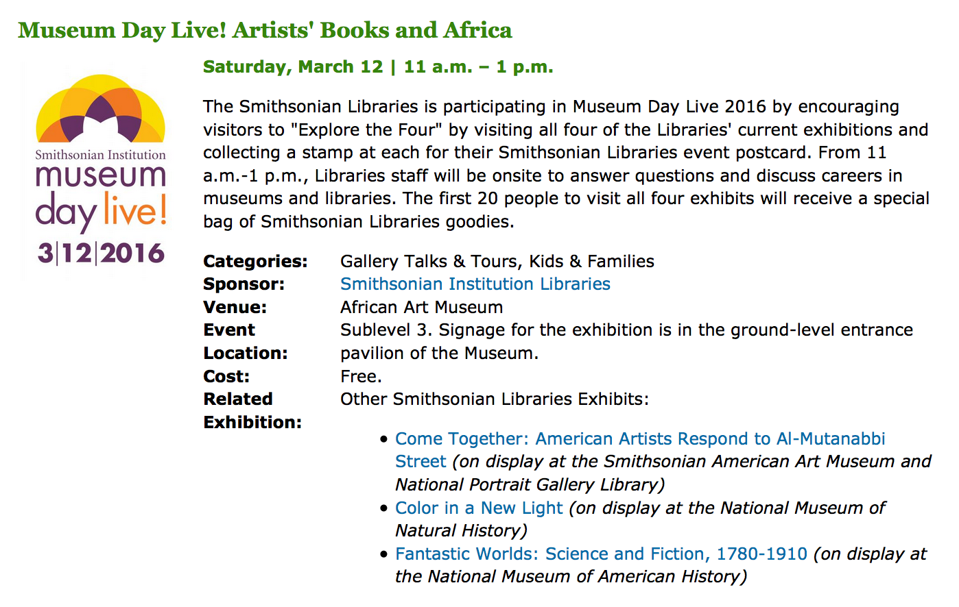 On Saturday, March 12, 2016, the White House and the Smithsonian Institution, together with hundreds of cultural institutions across the country, will celebrate a nationwide campaign to reach women and girls in under-served communities entitled Museum Day Live! Held during Women’s History Month, this event will encourage all people, and particularly women and girls of color, their peers and their families, to explore their nation’s museums, cultural institutions, zoos, aquariums, parks and libraries which will offer free admission for the day.